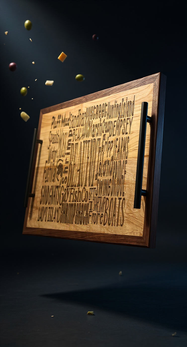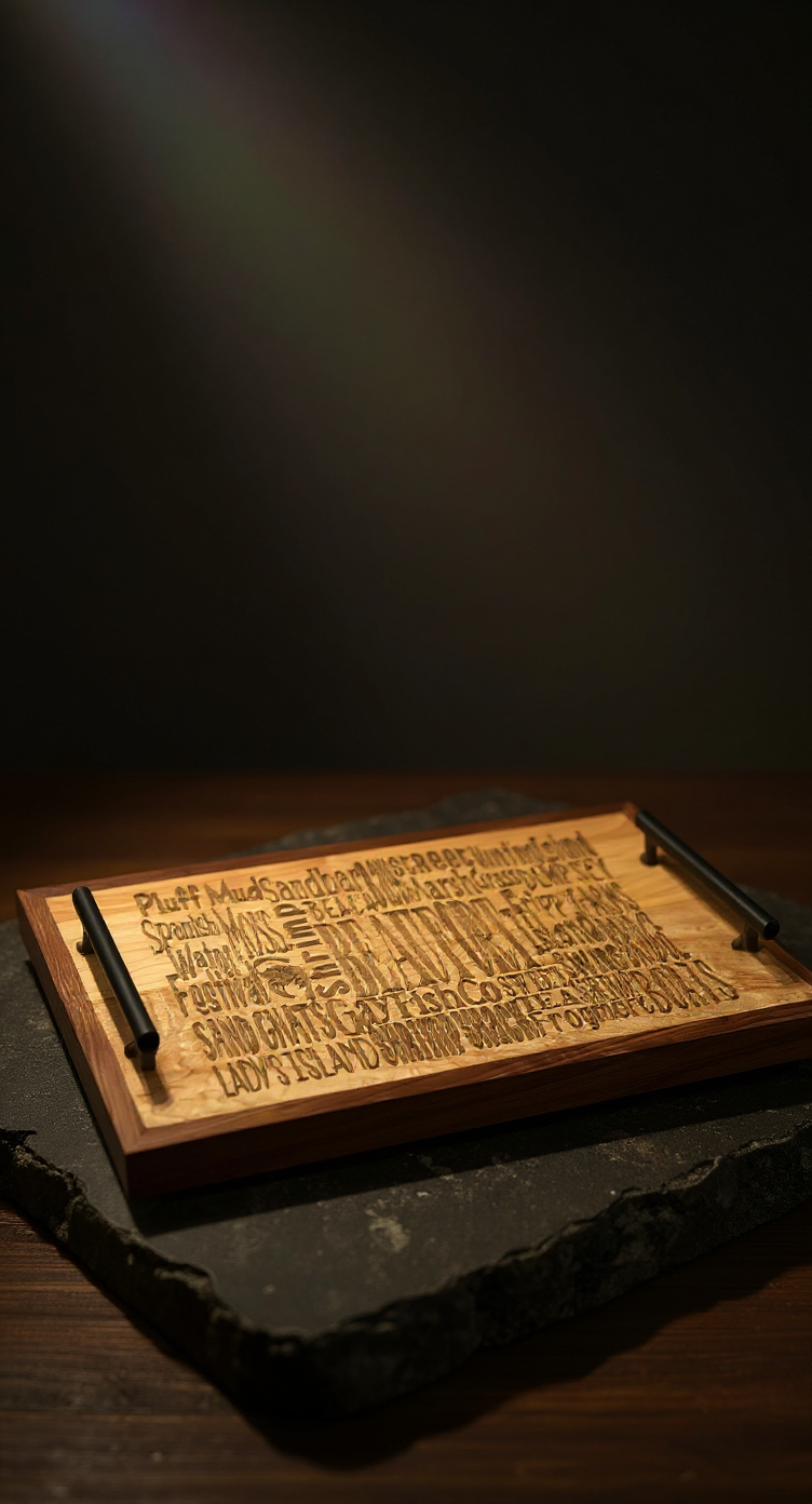 Introducing the Everything Beaufort Charcuterie Board, a handmade tray crafted from Walnut and Maple. This versatile piece serves as a charcuterie board, coffee table centerpiece, or elegant serving tray. Its unique engravings highlight popular Beaufort places and things, while the Black Walnut and Hard Maple showcase their natural beauty. With matte black aluminum handles and a functional size of 12 1/2 x 21 1/2 x ¾ inches, this tray adds warmth and character to any space. Handmade wood tray crafted from Walnut and Maple – perfect as a charcuterie board, coffee table centerpiece, or elegant serving tray. This stunning hardwood tray adds warmth and character to any space, combining artisanal craftsmanship with modern design.