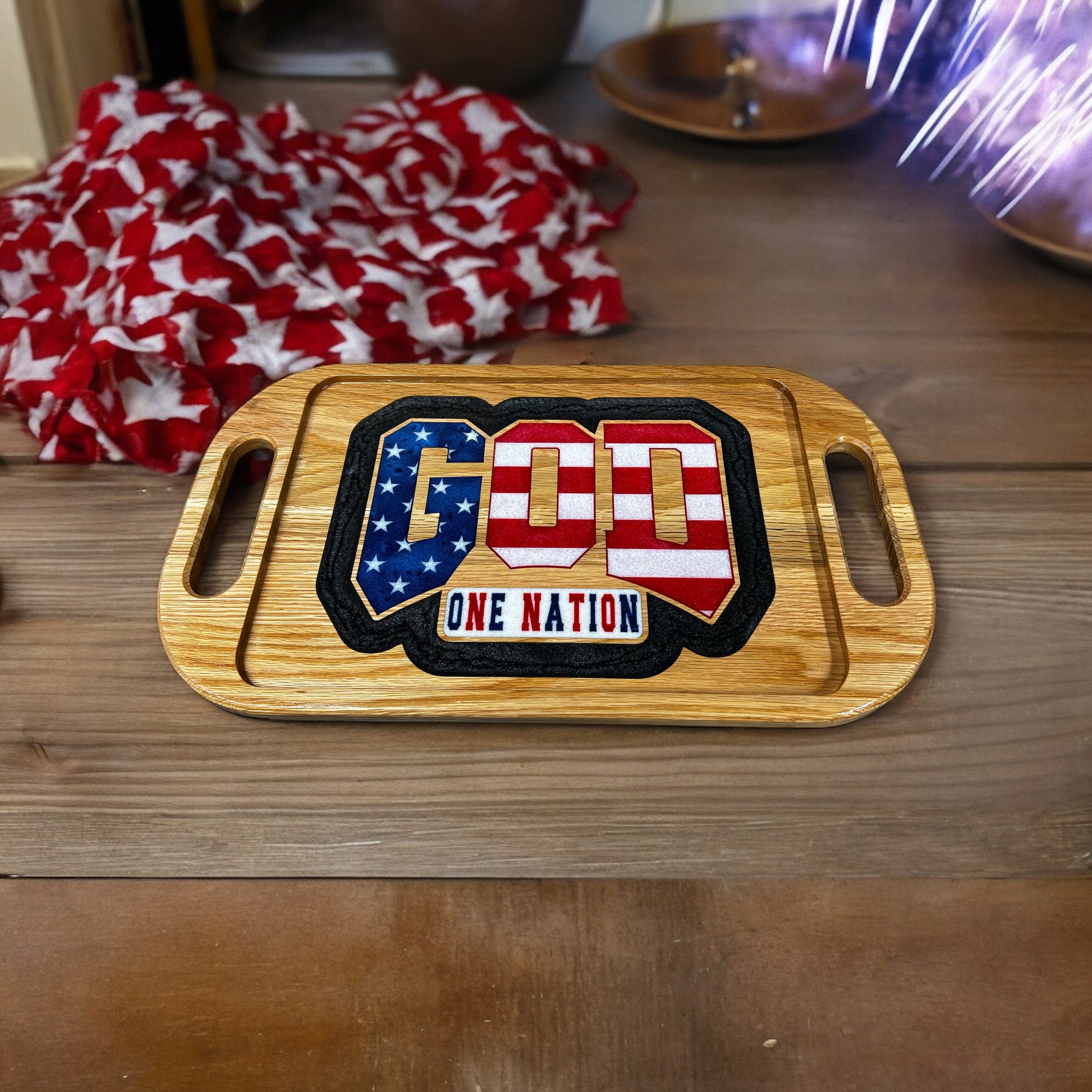 Enhance your home decor with our distinct red oak serving tray, showcasing a breathtaking "ONE NATION UNDER GOD" epoxy inlay with intricate layers that accentuate the oak's innate elegance and the epoxy's vivid hues. Perfect for impressing guests at any social gathering or event, the tray measures 20" x 11 1/4".