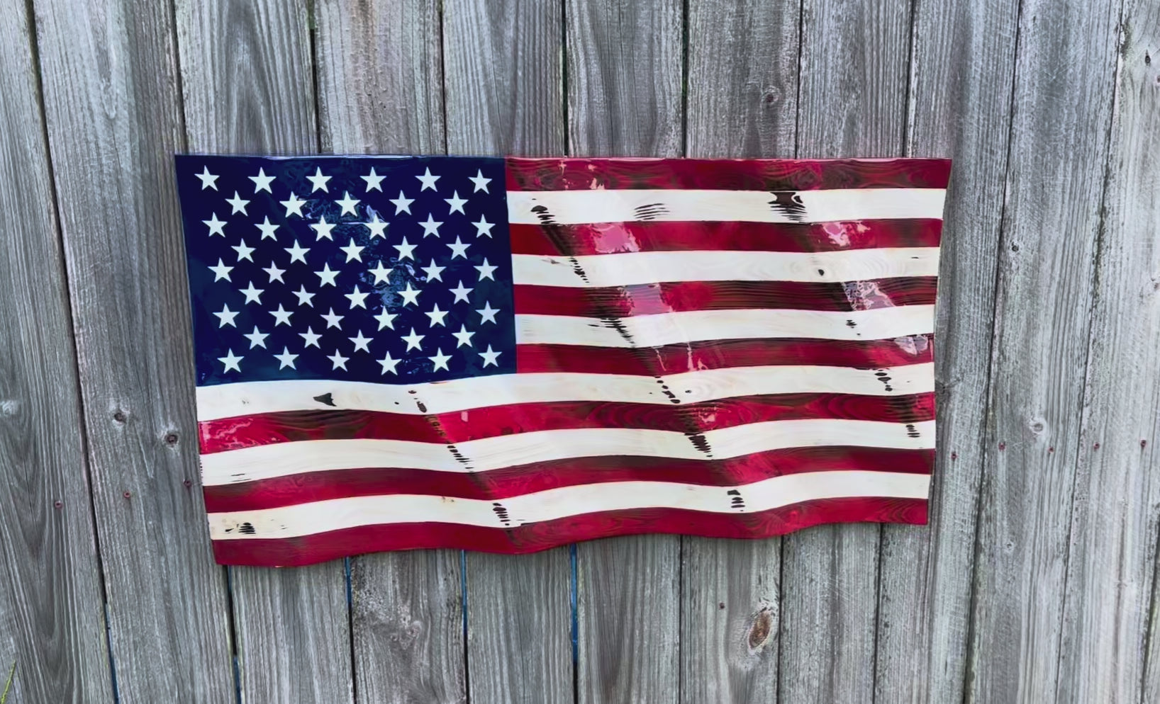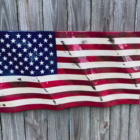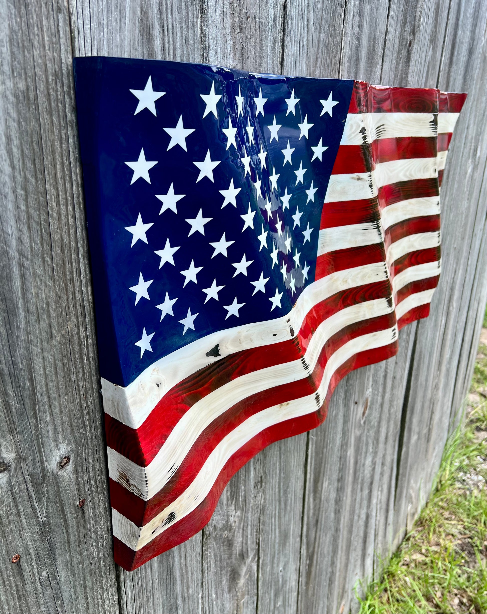 Crafted with precision and passion, our 36”x19 1/2” wooden wavy American flag is a labor of love. Each piece is meticulously selected and handcrafted to showcase its unique wood grains, resulting in a truly remarkable and attention-grabbing addition to any home decor or man cave. This flag embodies the spirit of freedom and ignites feelings of pride and patriotism in all who lay their eyes upon it. Finished off with a layer of super high gloss epoxy. Includes mounting hardware.